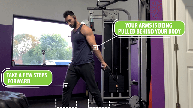 Grab a cable in your hand with your palm facing up. Take a few steps forward, so that your arm is pulled behind your body.