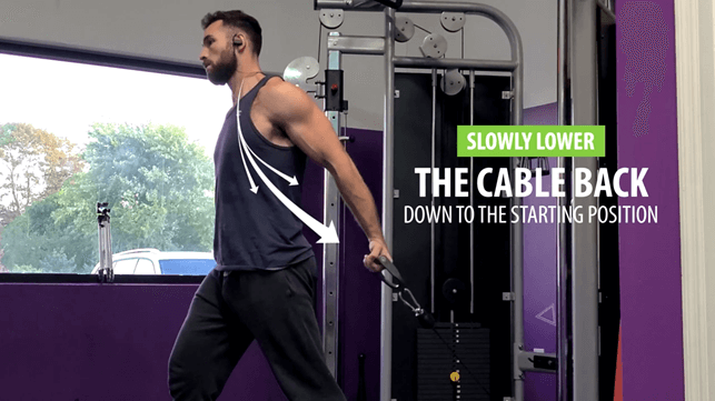 While still keeping your elbow back, slowly lower the cables back down to the starting position.