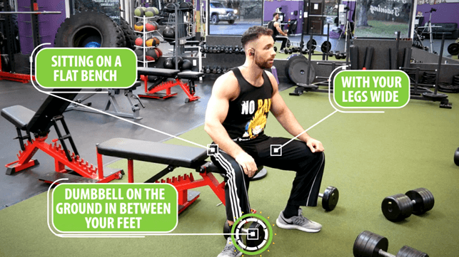 Start by sitting on a flat bench with your legs wide and a dumbbell on the ground in between your feet.