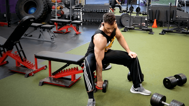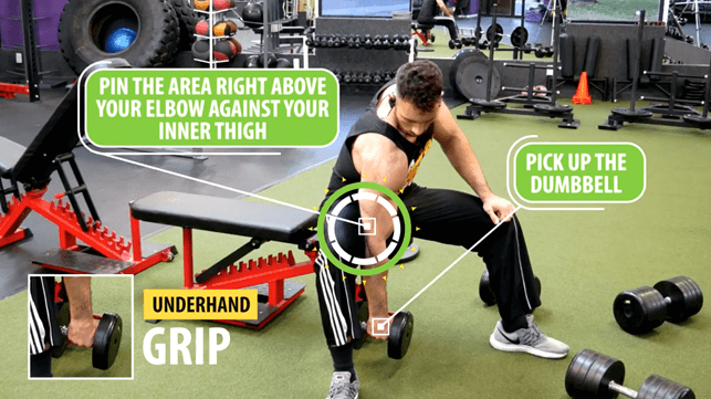 Pick up the dumbbell and pin the area right above your elbow against your inner thigh.