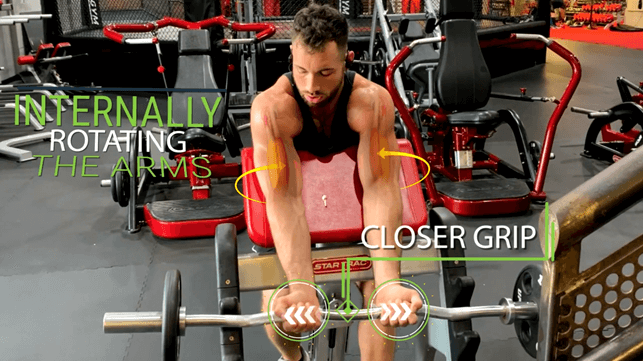 But by taking a closer grip and internally rotating the arms we can still effectively hit the long head.