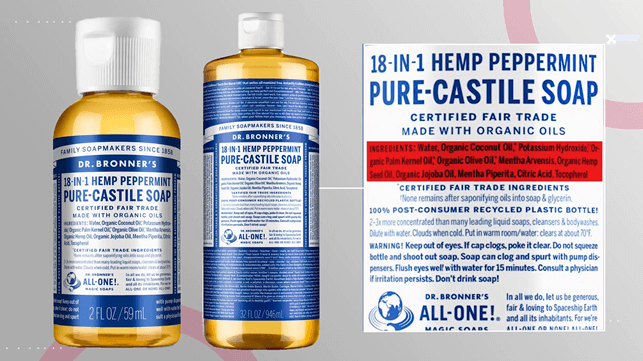 An example of this is pure Castile soap. By looking at the label you can clearly see the difference in the all-natural ingredients. (13)