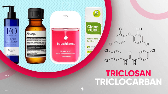Triclosan and triclocarban, both of which are antibacterial agents found in hand sanitizers, lotions, antibacterial soap, and more.