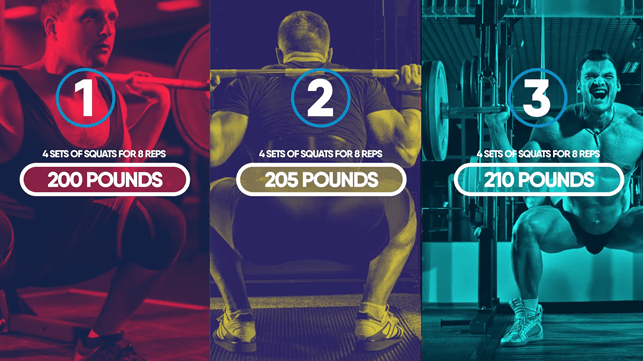 For example, let’s say you did 4 sets of squats for 8 reps with 200lbs during your last session.