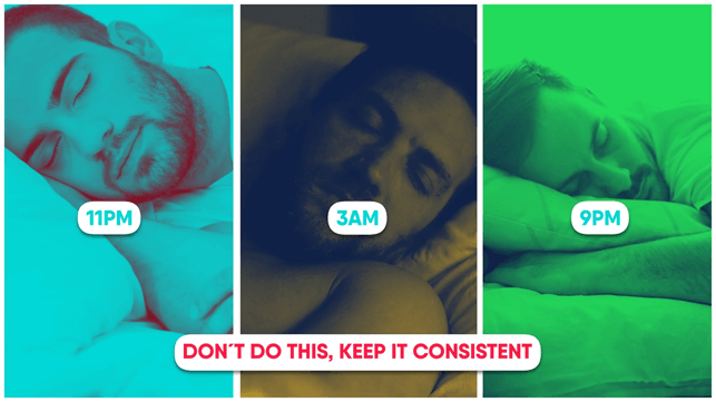 You shouldn’t be going to bed one day at 11pm, the next day at 3am, and the next day at 9pm… Keep it consistent.